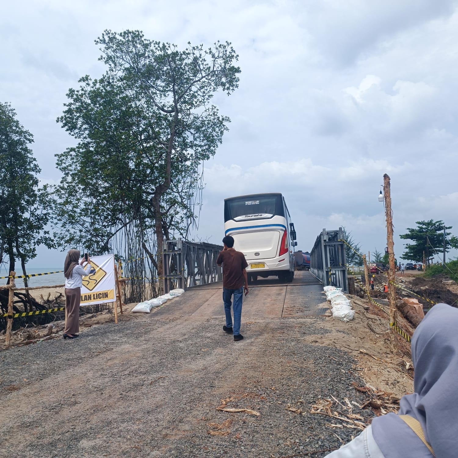 “Jembatan sementara ini memang 20 ton maksimal ya. Tapi untuk kendaraan over dimensi nanti akan disiasati dengan menurunkan alat berat dulu baru lewat jembatan, ” lanjutnya.